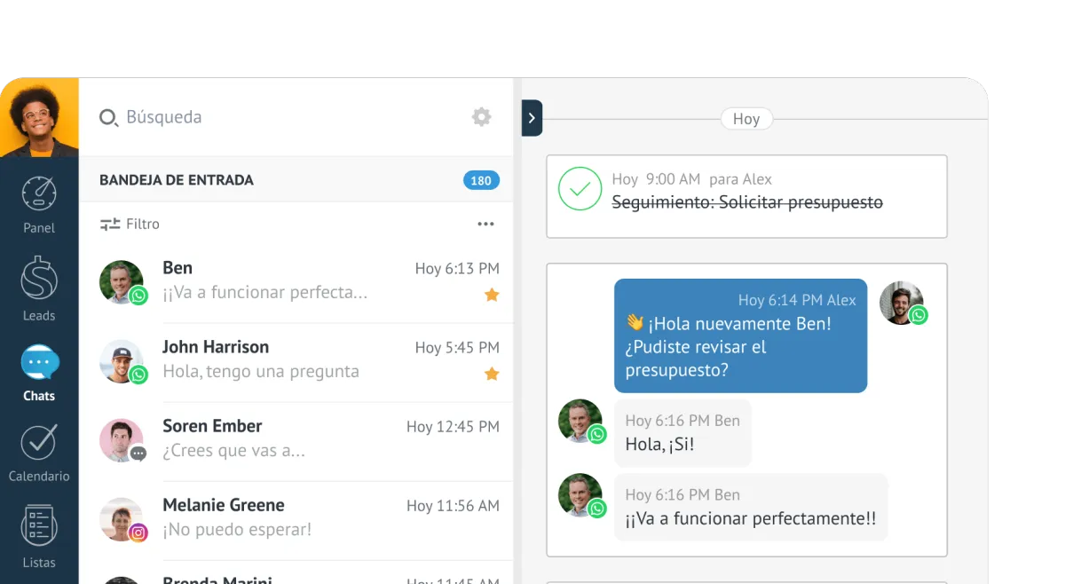 • Todas las herramientas de comunicación en un solo lugar, desde WhatsApp, Instagram y Facebook hasta correo electrónico y llamadas.